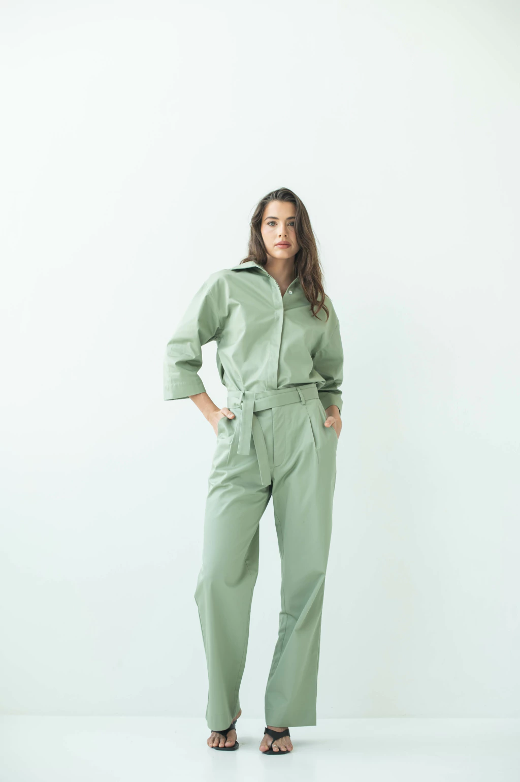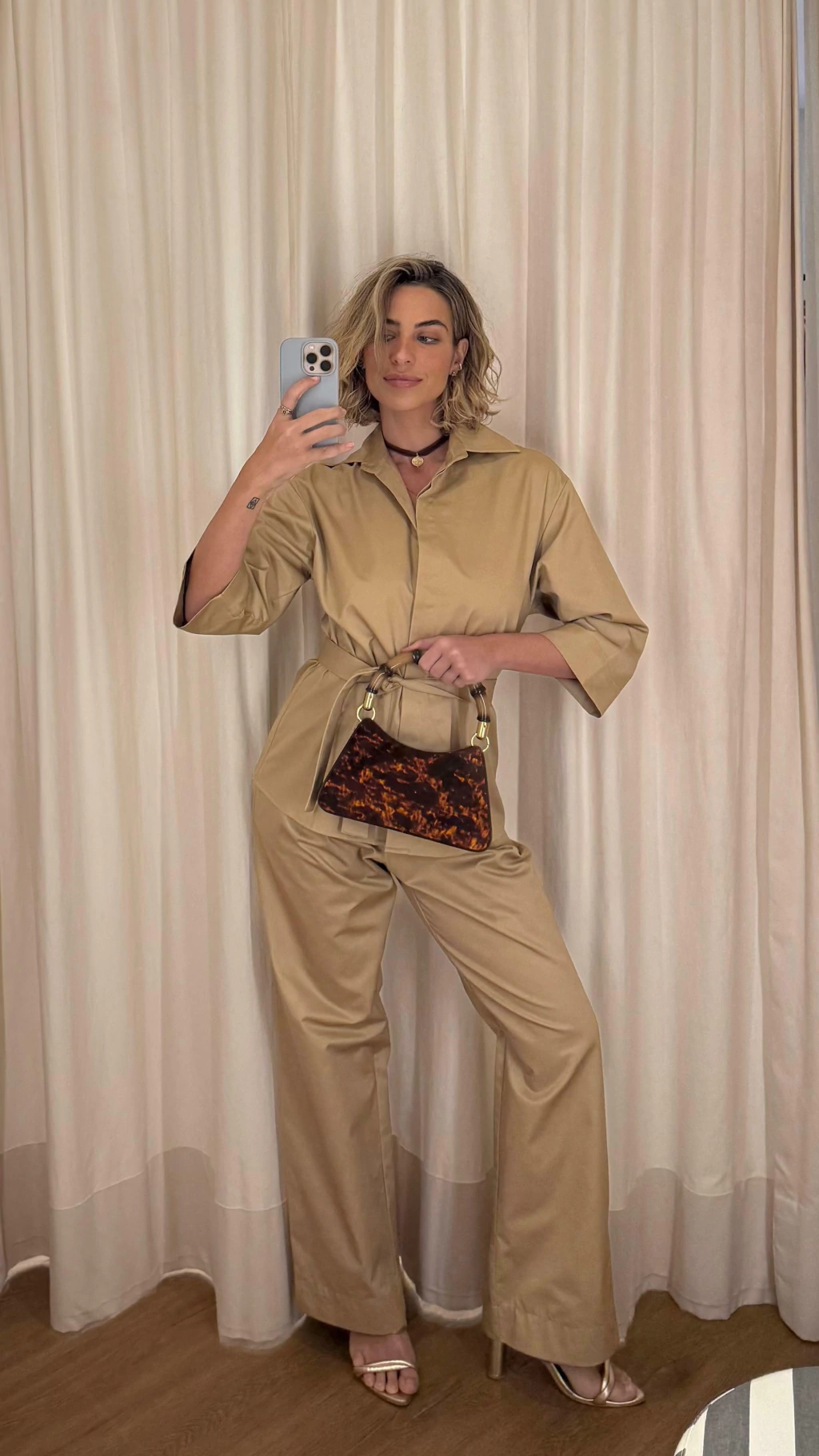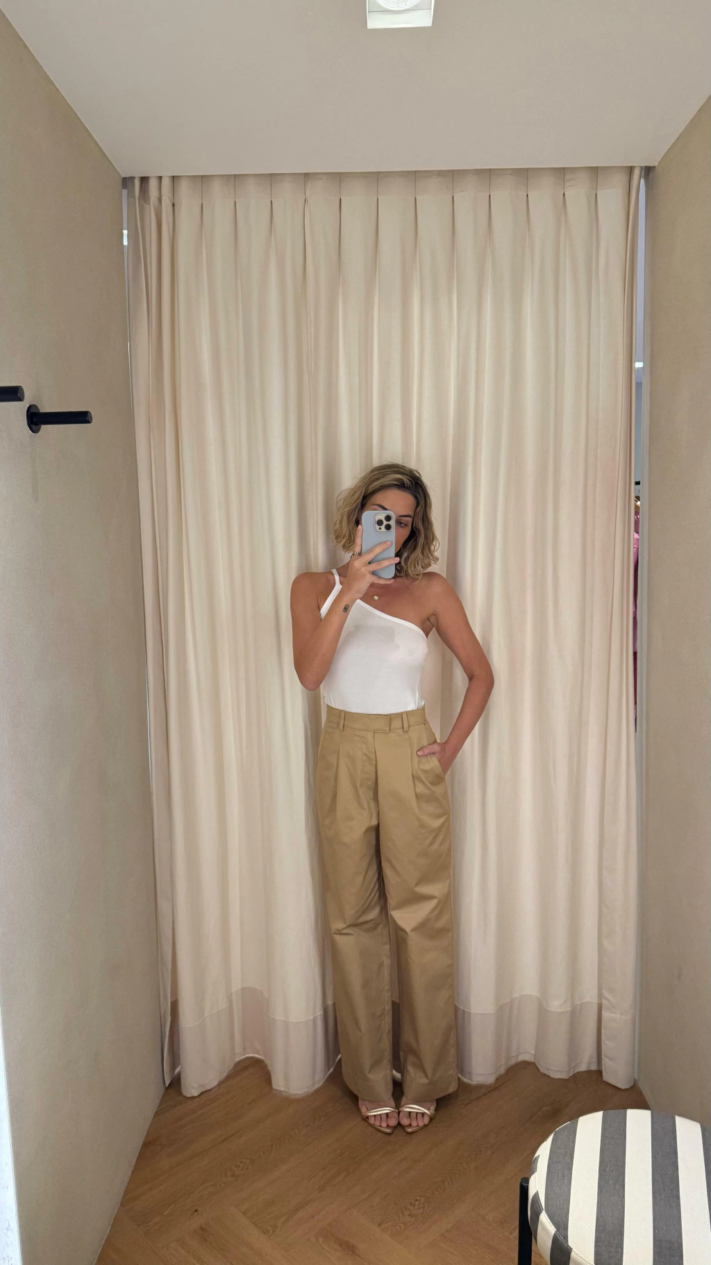 Calça Débora, feita em algodão puro nas cores: Caqui, verde menta, branco e preto, com modelagem mais soltinha, pregas frontais e cós estruturado.