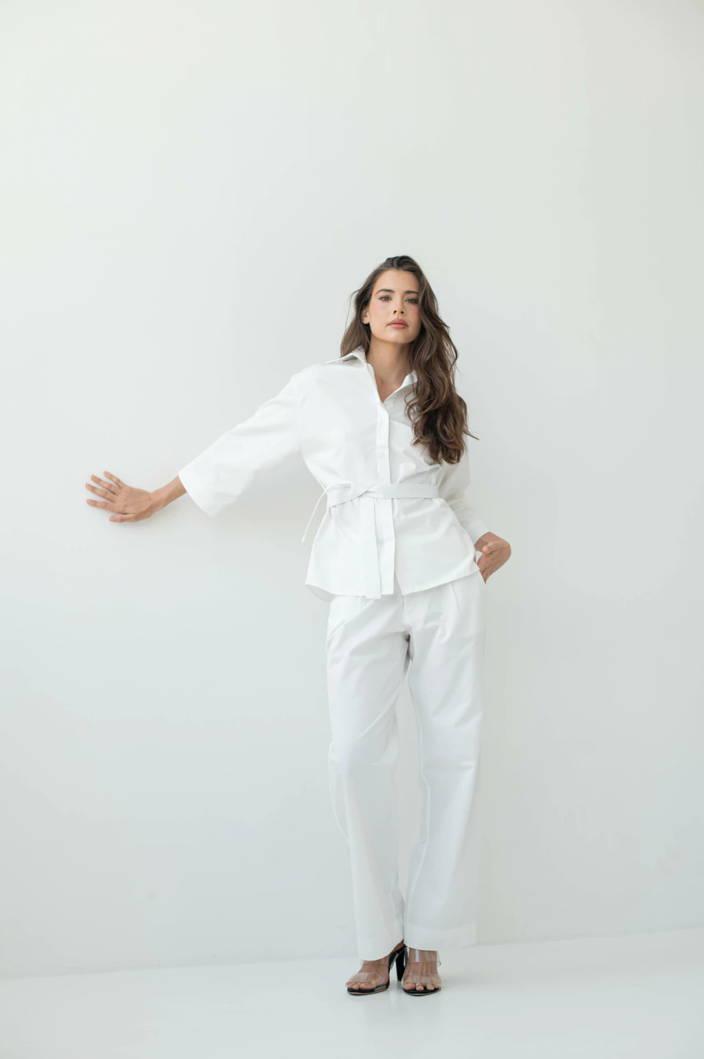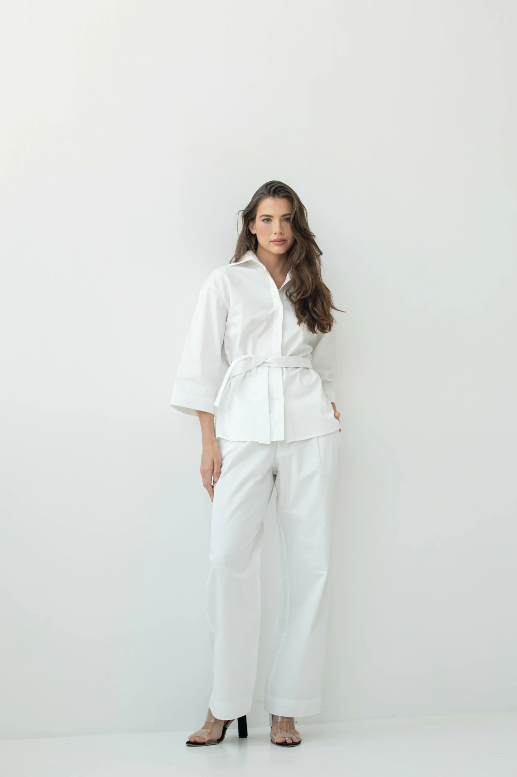 Camisa Débora, feita em algodão puro nas cores: Caqui, verde menta, branco e preto, com modelagem mais soltinha. O modelo acompanha faixa solta para cintura.