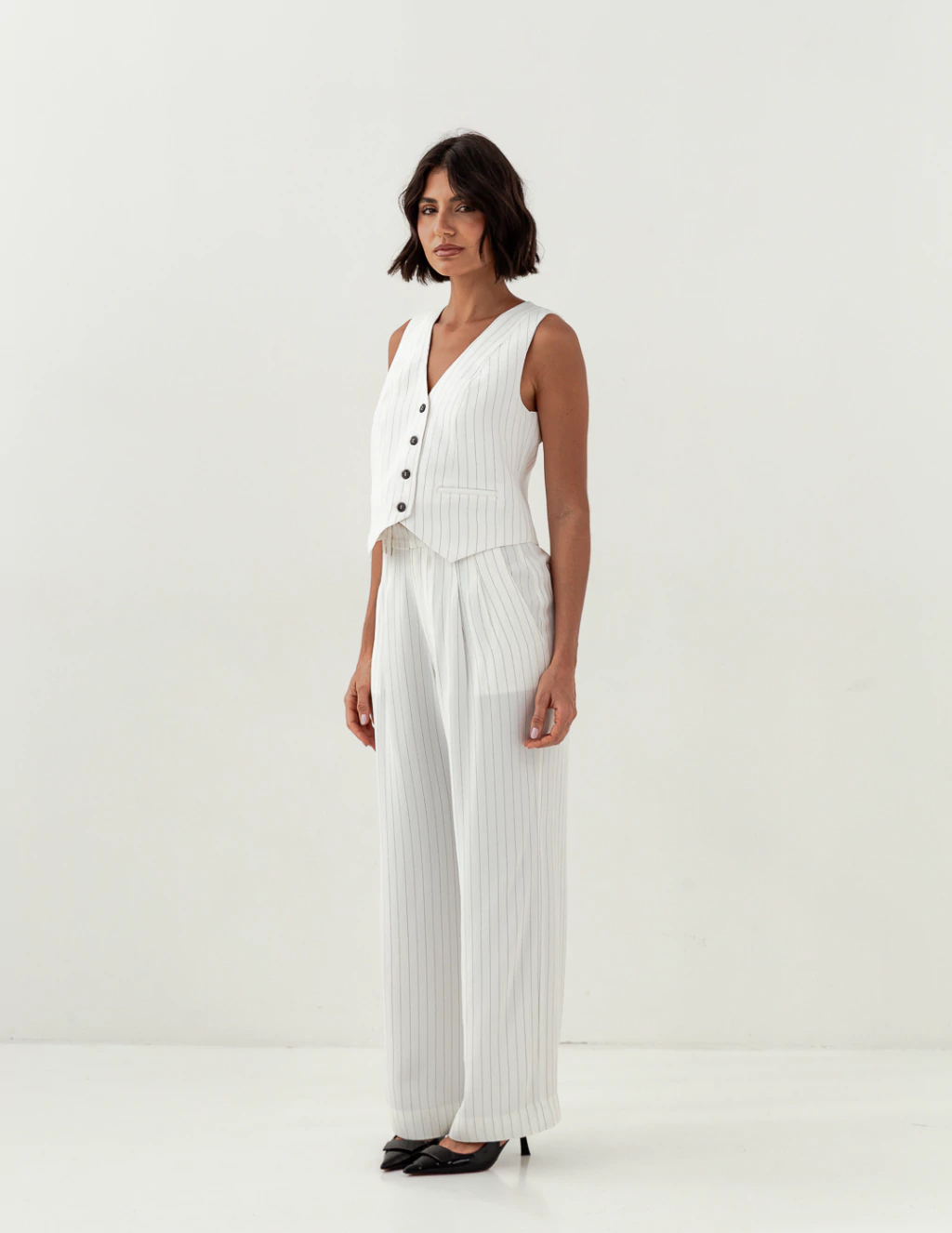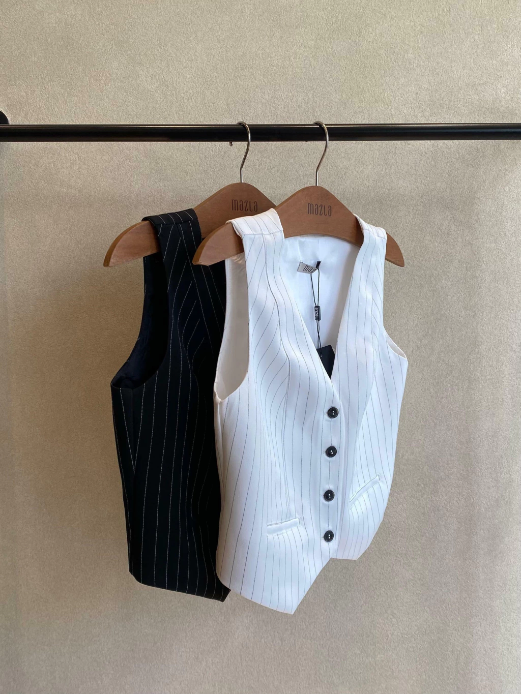 Colete Emmi risca de giz em acetato, nas cores off com listras pretas / preto com listra off, modelo clássico, botões frontais para fechamento, bolso clássico de alfaiataria frontal.