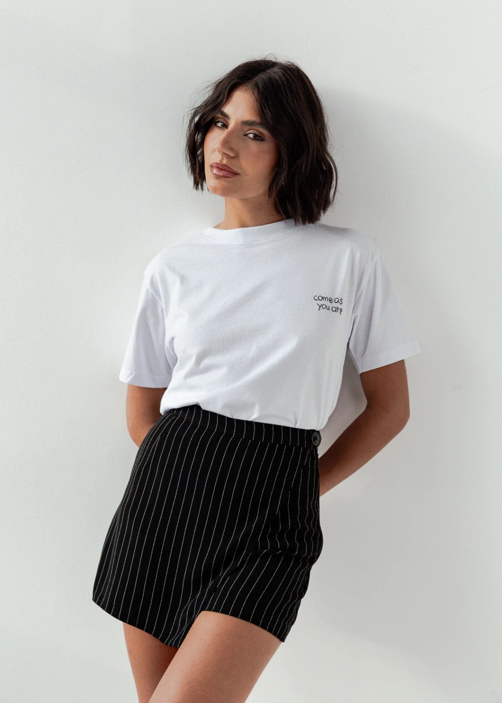 Short saia Emmi risca de giz em acetato, nas cores off com listras pretas / preto com listra off, modelo clássico, botão lateral para fechamento com Martingales, bolso clássico de alfaiataria frontal.